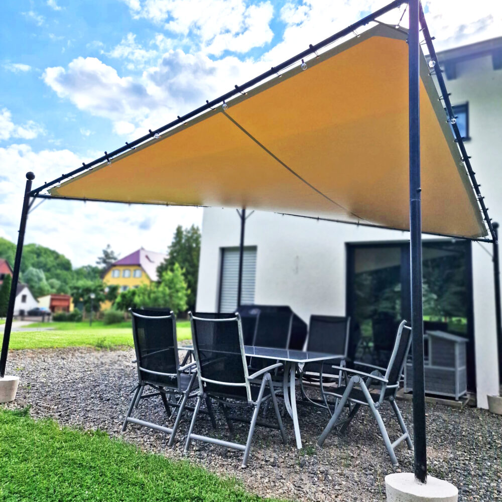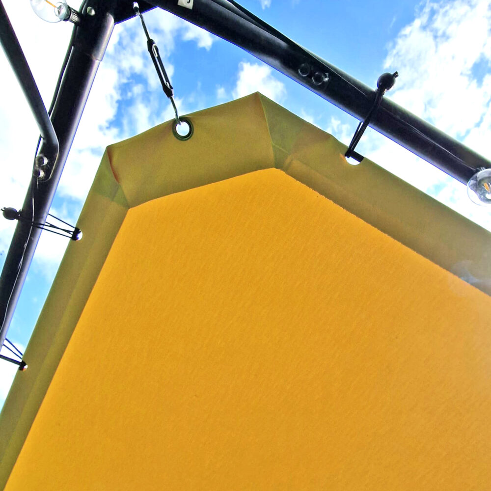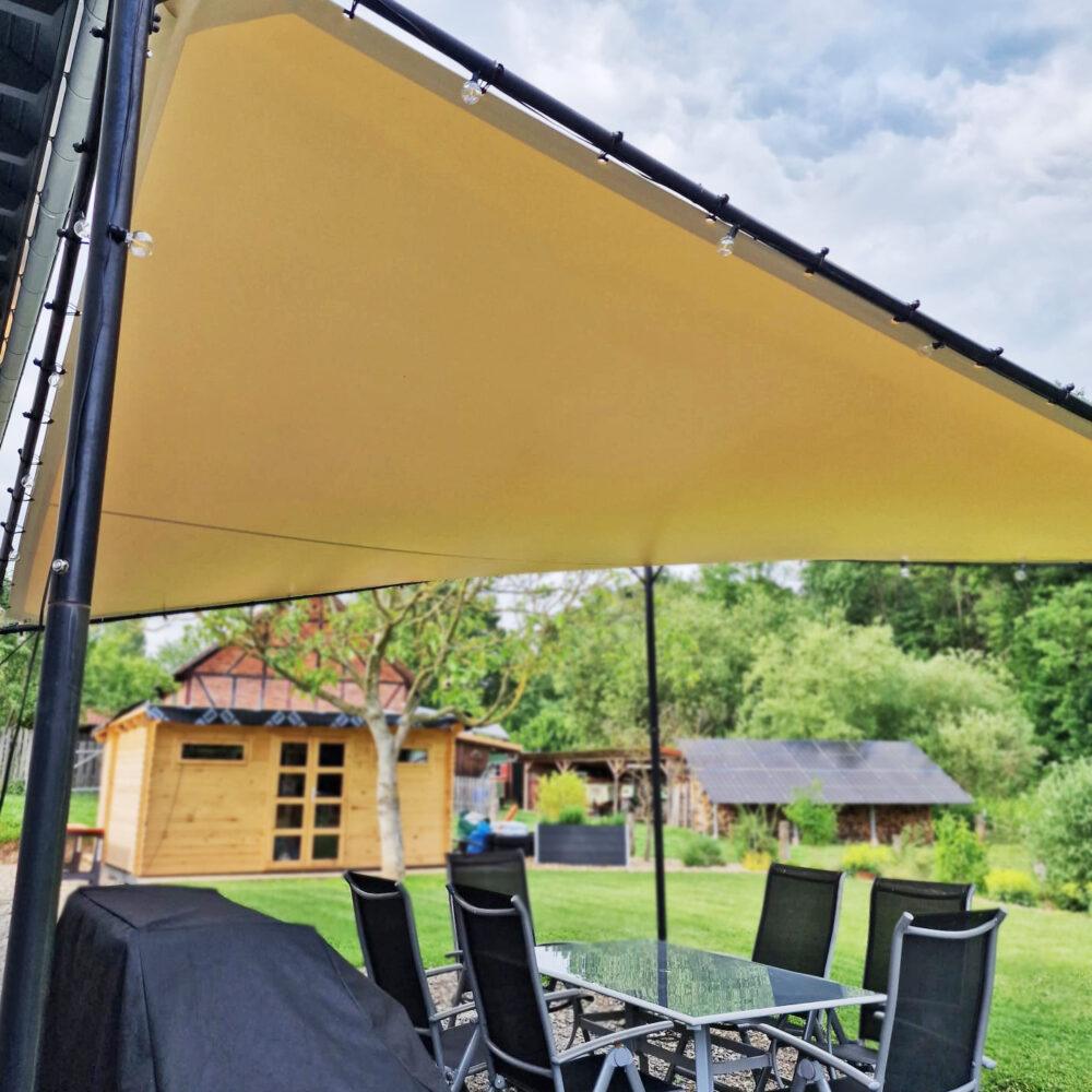 – für Pavillons mit 3,5×3,5 m Grundfläche (Planenmaß: 3,48 x 3,48m) - strapazierfähiges Material: hochwertiges, wasserdichtes, wetterfestes, gewebeverstärkter PVC- Planenstoff, 650–680g/m², Made in Germany